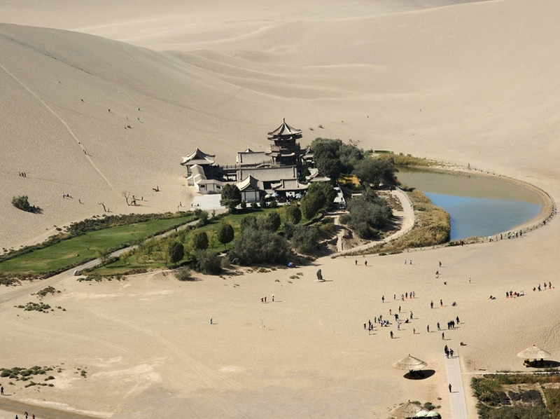 В самом сердце пустыни Гоби находится уникальный оазис, представляющий собой озеро в форме полумесяца. Рядом с озером располагается храм в традиционном стиле и сад. На фоне бескрайних песков Юэяцюань выглядит как мираж.