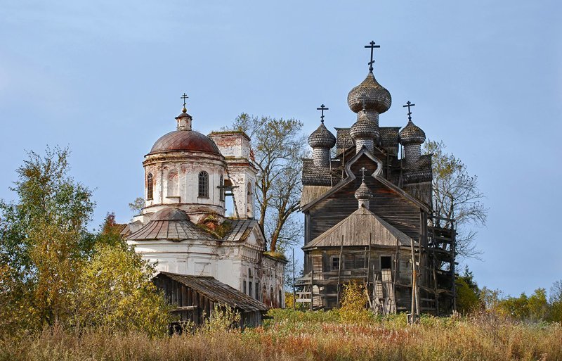 Церковь в Палтоге, Вологодской области (бывшее село Акулово). Деревянная церковь справа, построенная в 1733 году, сейчас реставрируется; Мария Кривошеина