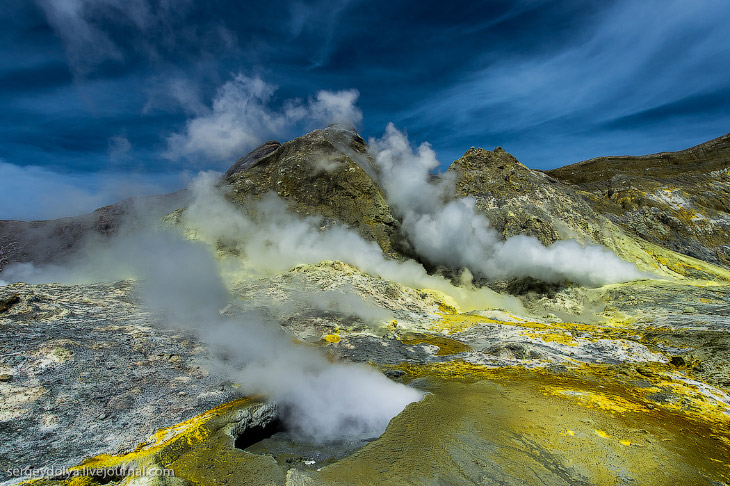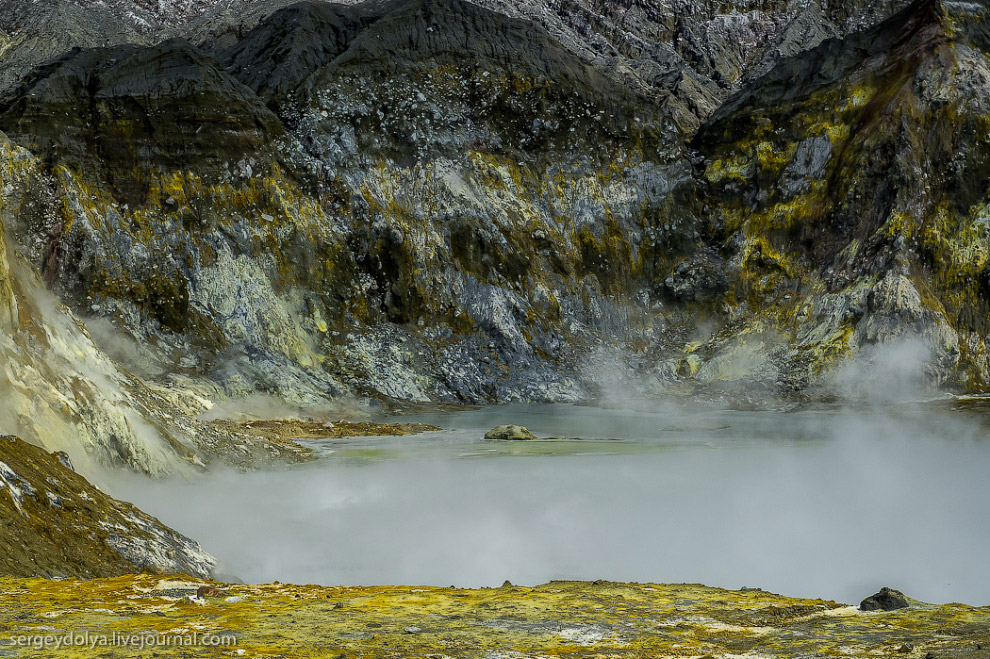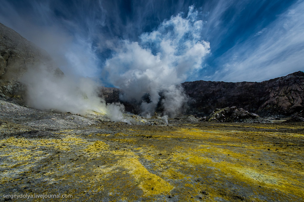 Остров Уайт в Новой Зеландии не совсем остров. На самом деле, это действующий вулкан, большая часть которого скрыта под водой. На поверхность выходит лишь макушка диаметром в два километра. Пейзажи острова изобилуют кислотными и неестественными красками, отчего кажется, что попал на другую планету. Не знаю, снимали ли тут фантастические фильмы, мне кажется, это самое подходящее место.