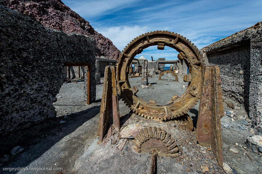 Улетаем с острова. Разрушенный серный завод на побережье: