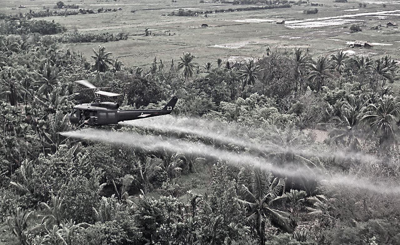20) Вертолёт армии США распыляет химическое оружие над джунглями Вьетнама, 1967 год.
