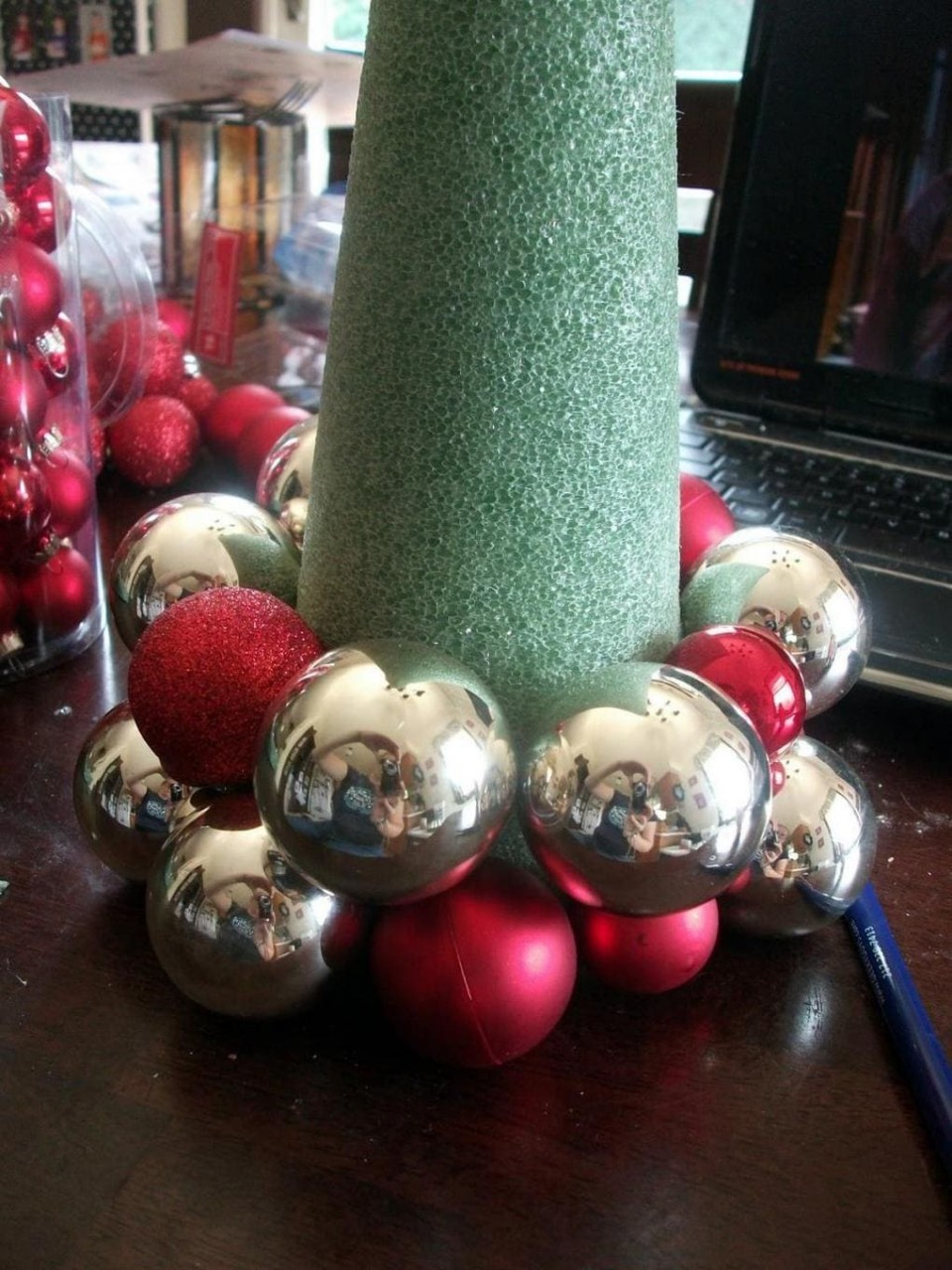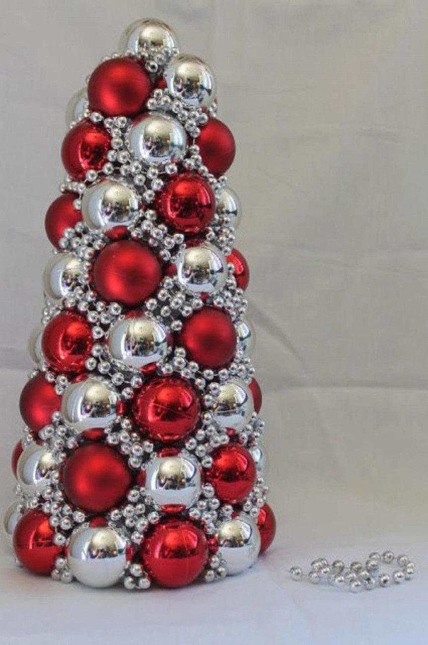 Конус, который послужит основанием для елки можно сделать из кусочка картона или поролона. Приклеить на него игрушки легко при помощи пистолета.