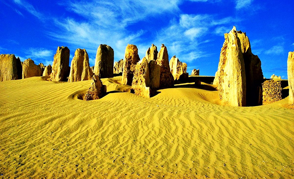 Австралия тоже славится многообразием пустынных пейзажей, одну из самых необычных пустынь континента стоит искать на территории национального парка Намбунг. Здесь помимо традиционных песчаных дюн можно увидеть невероятно красивые природные скульптуры из известняка, которые устремлены в небо на несколько метров. Пустыня башен привлекает туристов именно этими необычными формированиями, как удалось выяснить исследователям, возраст известняковых формирований составляет более 25 000 лет.