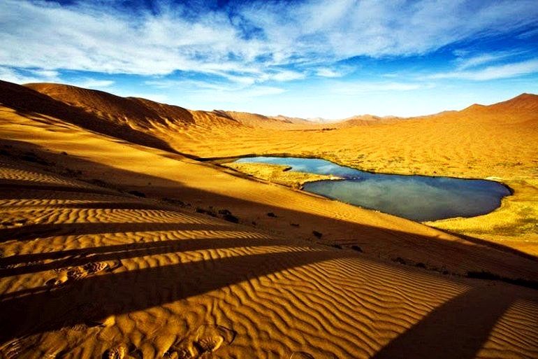 Еще одной интересной особенностью пустыни являются красивые озера, расположенные у подножия дюн. Некоторые озера являются пресными, а вода в других очень соленая. Площадь удивительной пустыни составляет 49 000 кв. км, во многом ряду своих особенностей она обязана талым грунтовым водам. На территории пустыни насчитывается более ста озер, которые постоянно подпитывают подземные родники, они берут начало за сотни километров от границ пустыни. Название пустыни Бадын-Джаран с монгольского дословно можно перевести как «таинственные озера», ее водоемы действительно являются уникальной природной достопримечательностью.