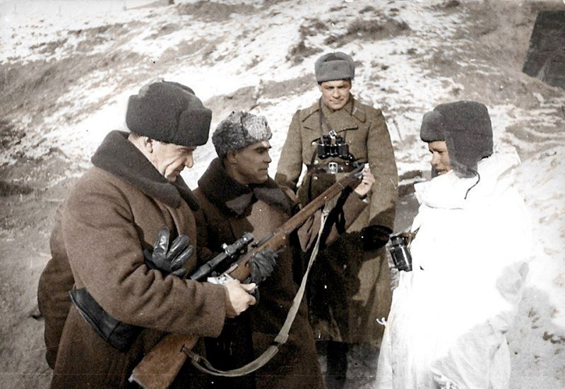 Легендарный снайпер 284-й стрелковой дивизии Василий Григорьевич Зайцев и его ученики отправляются в засаду. Декабрь 1942 года