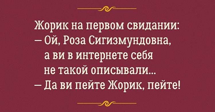 – Аркаша, ты вроде собрался выпить только за мое здоровье, а уже шестой стакан хлещешь, – причитает жена Софа. – Неужели я так плохо выгляжу?