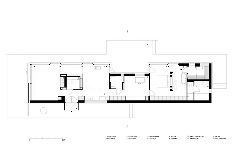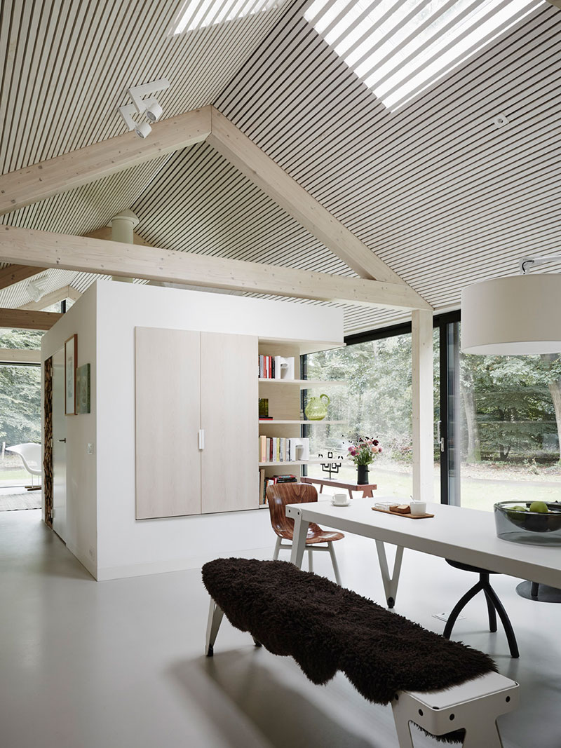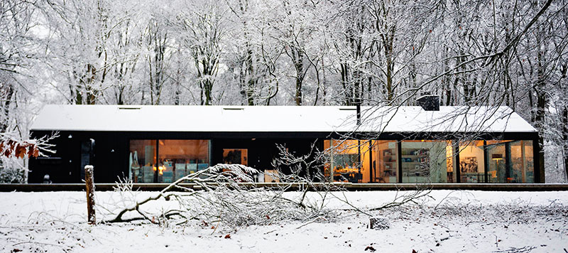 Этот потрясающий коттедж в Нидерландах одновременно напоминает и жилье из будущего, и дом из сказки. Здание выглядит небольшим: оно одноэтажное, но вытянуто в длину — так что здесь нашлось место для всех необходимых комнат. Конечно, главная изюминка — это огромные окна с видом на лес и поляну. Летом весь дом дышит свежестью, а зимой, когда выпадает снег, погружается в волшебство и уют. Простая геометрия здания, а также близость к природе стали вдохновением и для минималистичного интерьера. Светлые тона, простая мебель и интересные картины — вот гармоничный рецепт дизайна для этого дома. Как было бы здорово провести вечер в этом доме: устроиться с чашечкой чая у камина и смотреть на падающий снег!