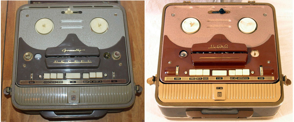 Grundig TK820, 1955 — «Мелодия МГ-56», 1956. Советский магнитофон появился на год позже, чем немецкий проигрыватель. Устройство из СССР повторяло и дизайн, и функции западной технологии.