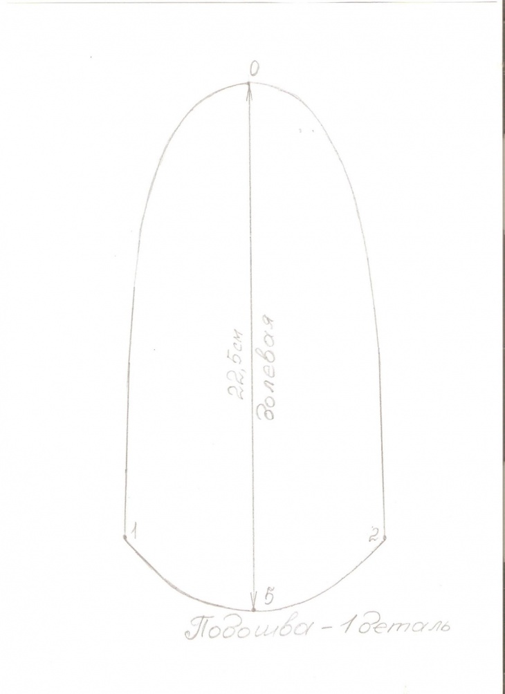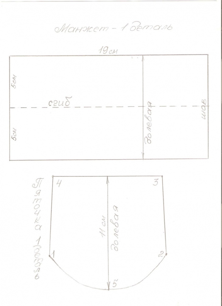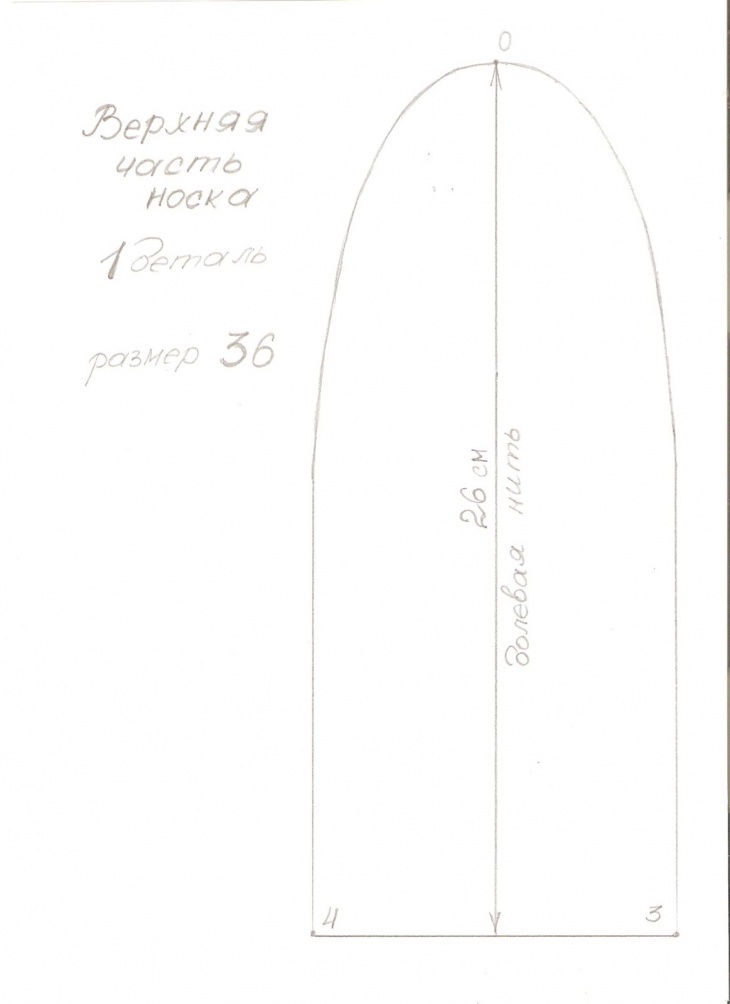 Сшиваем детали «подошва» и «пяточка» от точки 1 до точки 2. Соединяем готовую подошву с верхней частью носка от точки 3 до точки 4, совмещая центр (точка 0 на выкройке). Сшиваем манжет, складываем и пришиваем к верху носка.