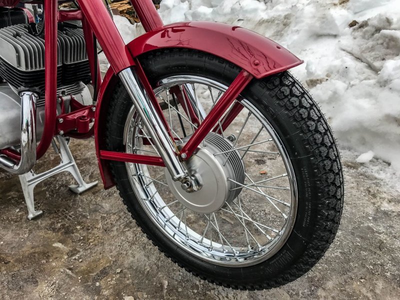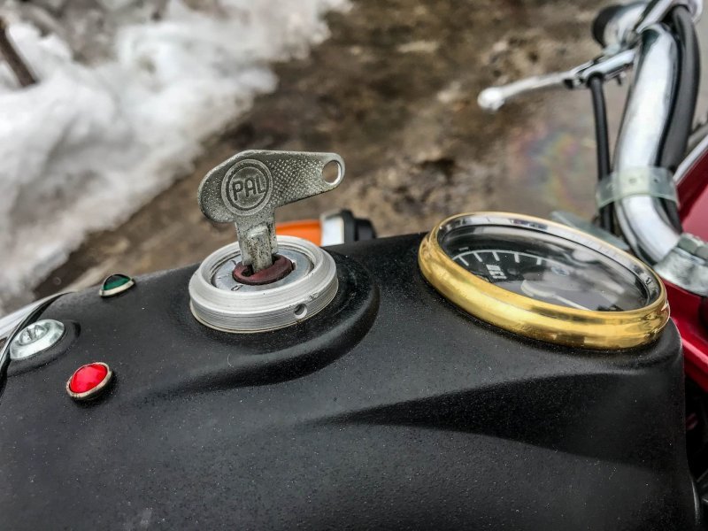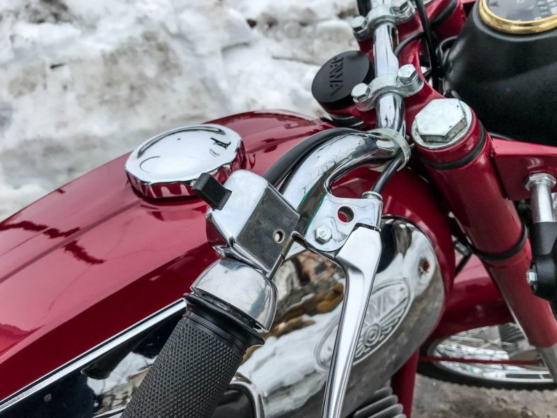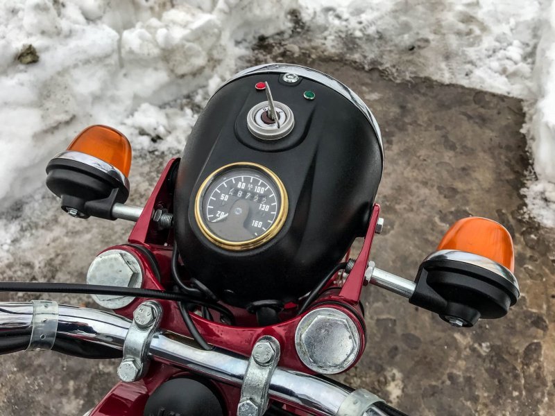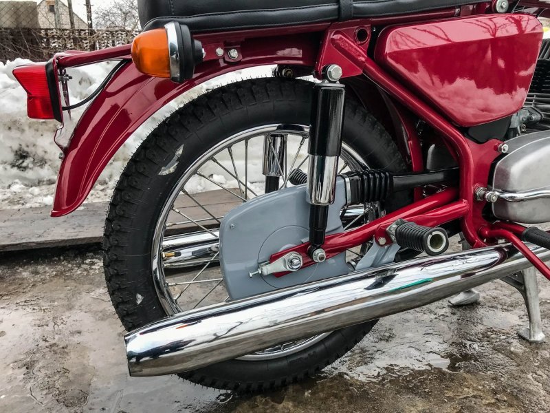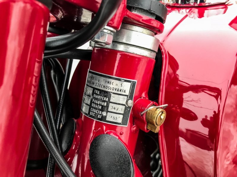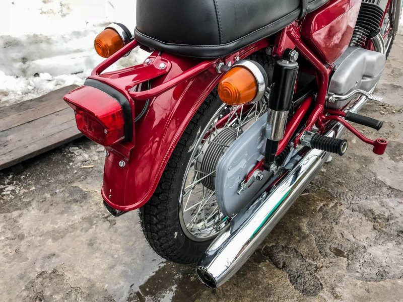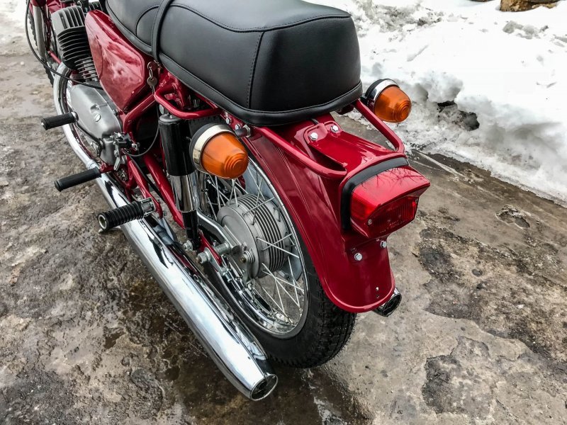 Реставратор старался по-максимуму использовать оригинальные запчасти и комплектующие из старых запасов. Например, были найдены абсолютно новые пульты, задний стоп, амортизаторы. Из "новодела" тут только глушители, современная резина Mitas в заводском размере, ручки и резинки на подножках.