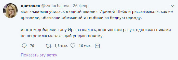 Пользовательница твиттера Светлана Чалова под ником "цветочек" рассказала, что ее знакомая училась с Ириной Шейк. Как выяснилось, последнюю в школьные годы дразнили сверстники, обзывали "обезьяной" и гнобили за бедную одежду.