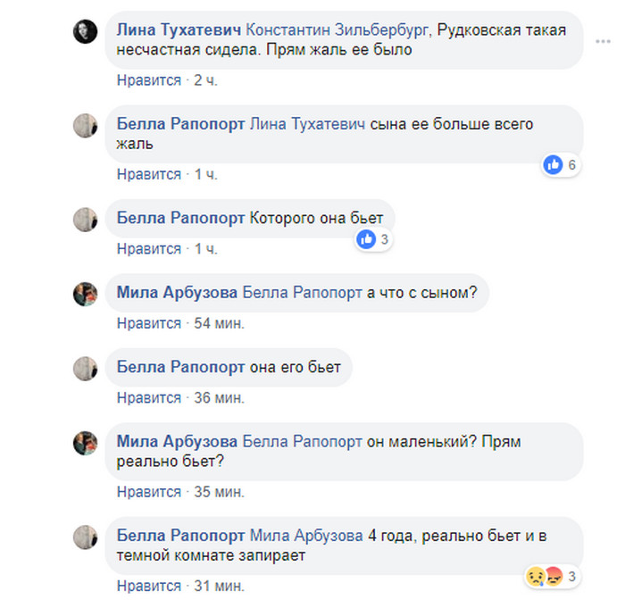 "Сына ее больше всего жаль. Которого она бьет 4 года, реально бьет и в темной комнате запирает", - написала Белла Рапопорт о сыне Рудковской.