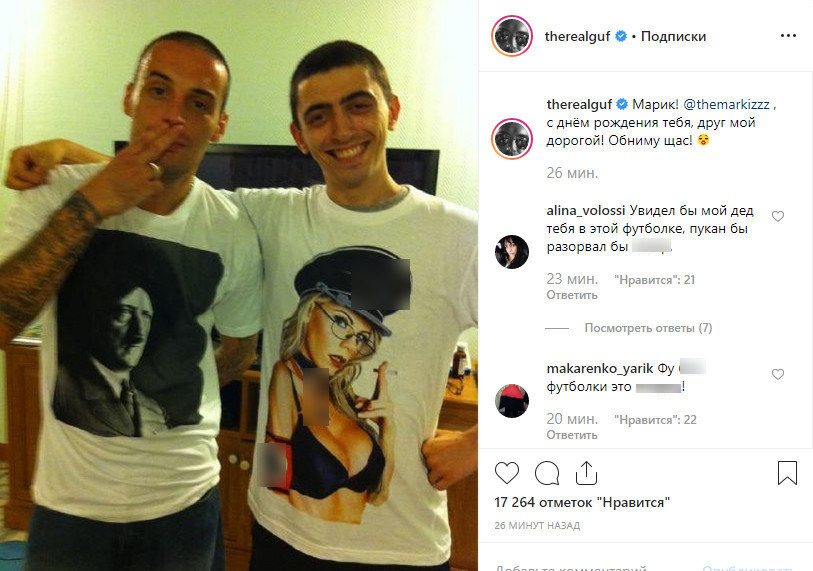 "Увидел бы мой дед тебя в этой футболке, пукан бы разорвал бы", "Футболка ******! Как лечиться так в Израиль, а футболки такие мерзкие не смущают вообще", "Деды воевали зря... аж трясёт", "Ты же гуф еврей, забыл про холокост?????", "Ты чё ******** с кем футболку нацепил, черт, отписка", "Хаель Гуфлер", "Мои деды не за подобную **** воевали... Это плевок. Совсем грани не видите...", - написали пользователи сети.