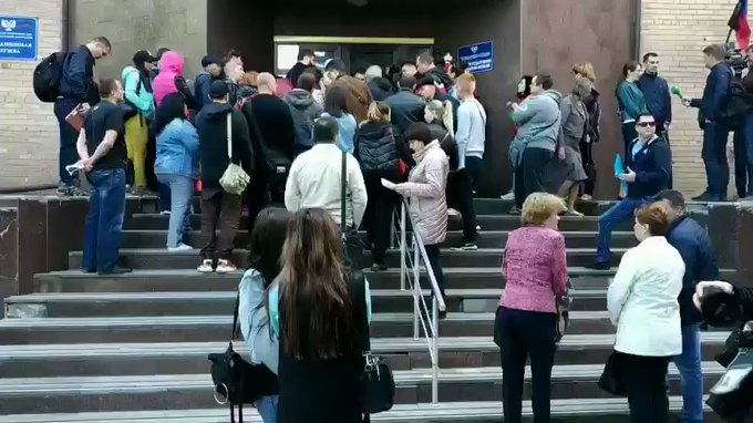 "В миграционной службе МВД ДНР сейчас очередь, - отметила у себя в Twitter журналист Юлия Витязева, опубликовав видео с места. - Люди стоят, чтобы подать документы на оформление паспорта гражданина Российской Федерации".