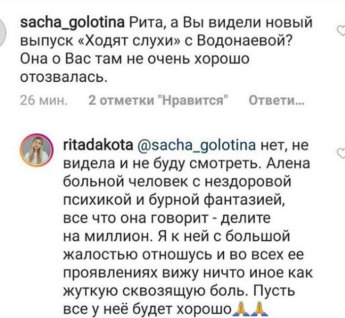 "Не видела и не буду смотреть. Алена больной человек с нездоровой психикой и больной фантазией, все, что она говорит - делите на миллион. Я к ней с большой жалостью отношусь и во всех ее проявлениях вижу не что иное, как жуткую сквозящую боль. Пусть все у нее будет хорошо", - написала Рита Дакота.