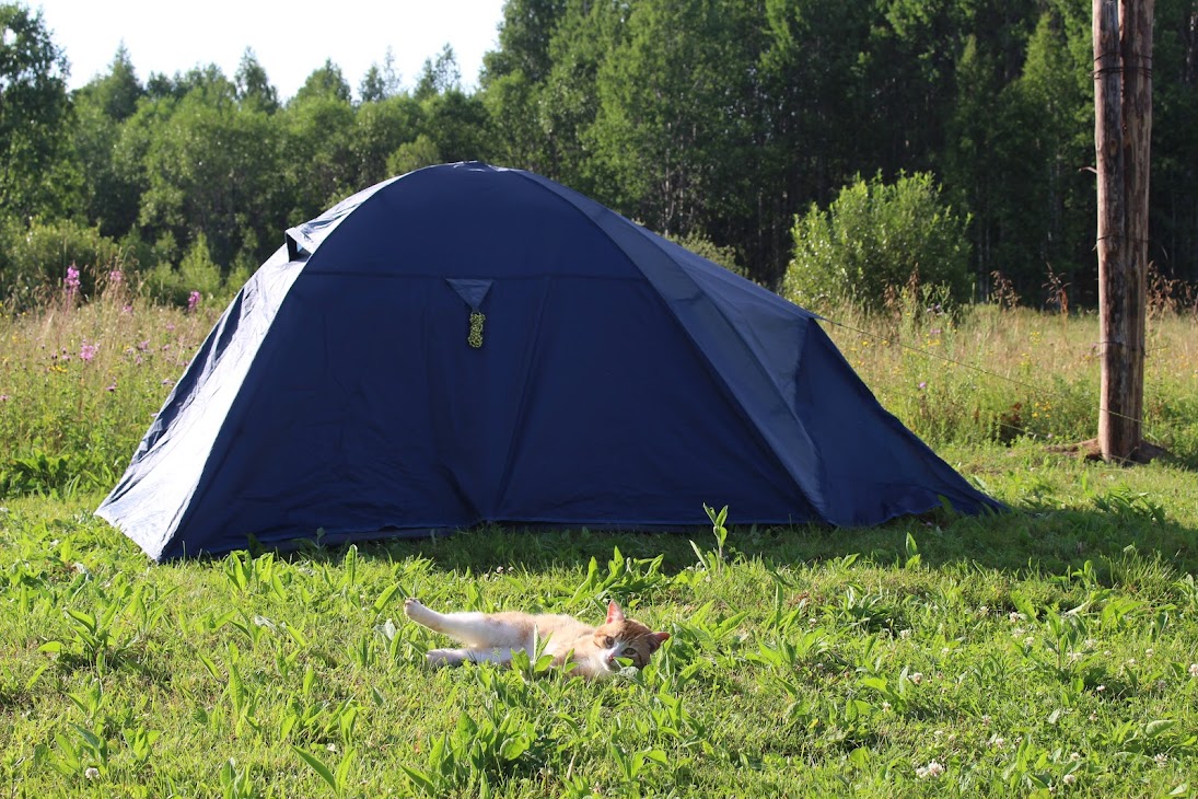 Ограда погоста заперта на замок, и я иду вдоль берега в направлении кордона. У первого домика на стук никто не отзывается, я устраиваюсь в беседке, и ставлю чайник, поскольку 15 км без воды очень утомляют. Тем временем, хозяин замечает меня и направляет лодку к берегу. Оказывается, дом егеря парка - следующий. Прохожу стоянки, заваленные вещами каких-то водников, и стучусь в дом, где тоже никого нет. Вскоре приплывает и сам смотритель - Михаил. После знакомства он говорит, что стоянки заняты, сейчас придет 36 детей и их руководители (я видел их утром, на стоянке у Масельги). Мысленно прощаюсь со спокойным отдыхом и единением с природой в сердце Кенозерья. Михаил предлагает поставить палатку около его домика. К стоянке прилагается пара модных рыжих котов, постоянно ворующих еду)