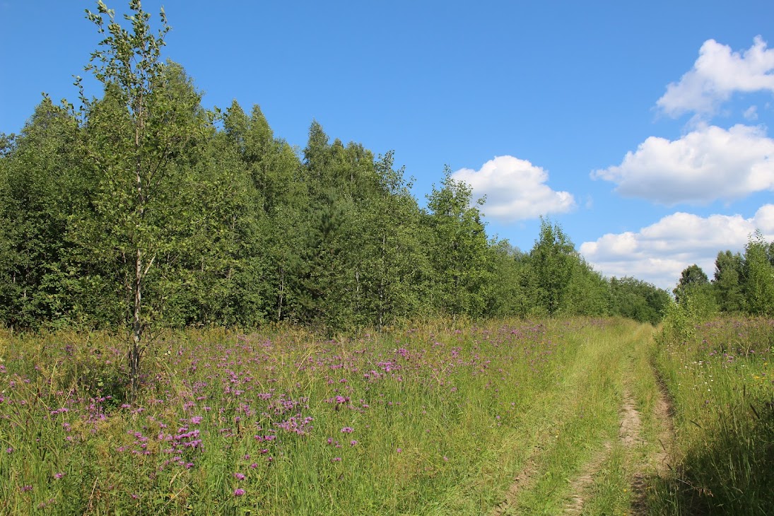 Михаил говорил, что есть проложенная тропинка вдоль ЛЭП, но я не сразу нашел ее начало и успел немного побарахтаться в траве с рюкзаком. Деревни расположены совсем близко, что-то около полутора километров, так что вскоре на горизонте показывается и Ведягино