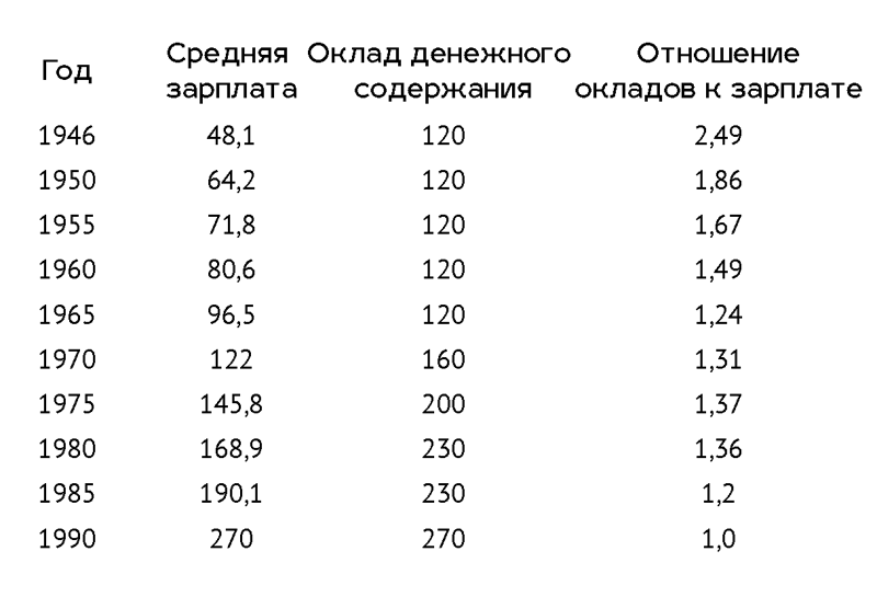 средней заработной платы и окладов денежного содержания командира взвода с 1946 по 1990 г. руб./мес.