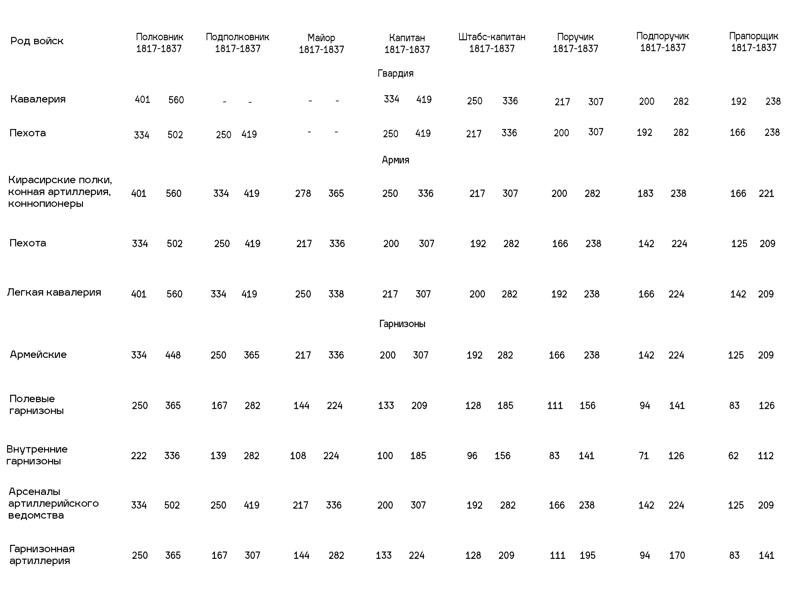 Жалованья офицеров в разных родах войск также были неравнозначными. Из данных таблицы видно, что оклады кавалеристов выше, чем в пехоте, а в армейских частях выше чем в гарнизонных. Для сравнения, в 1817 г. полковник кавалерии получал 401 серебряный рубль, пехотинец того же ранга – 331 руб., в армейских частях – 401 руб., в гарнизонных – 334 руб.
