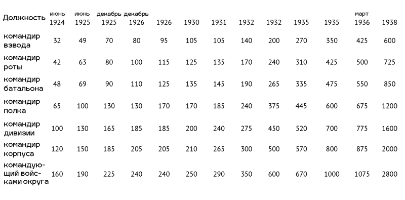 Динамика окладов денежного содержания офицерского состава Сухопутных войск за период с 1 июня 1924 г. до ноября 1938 г.