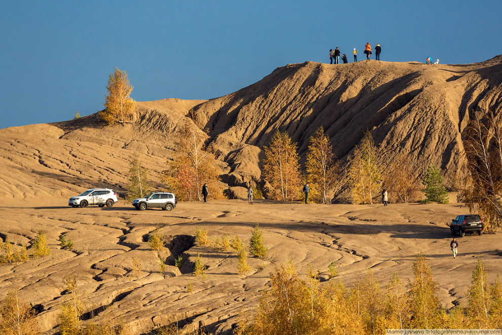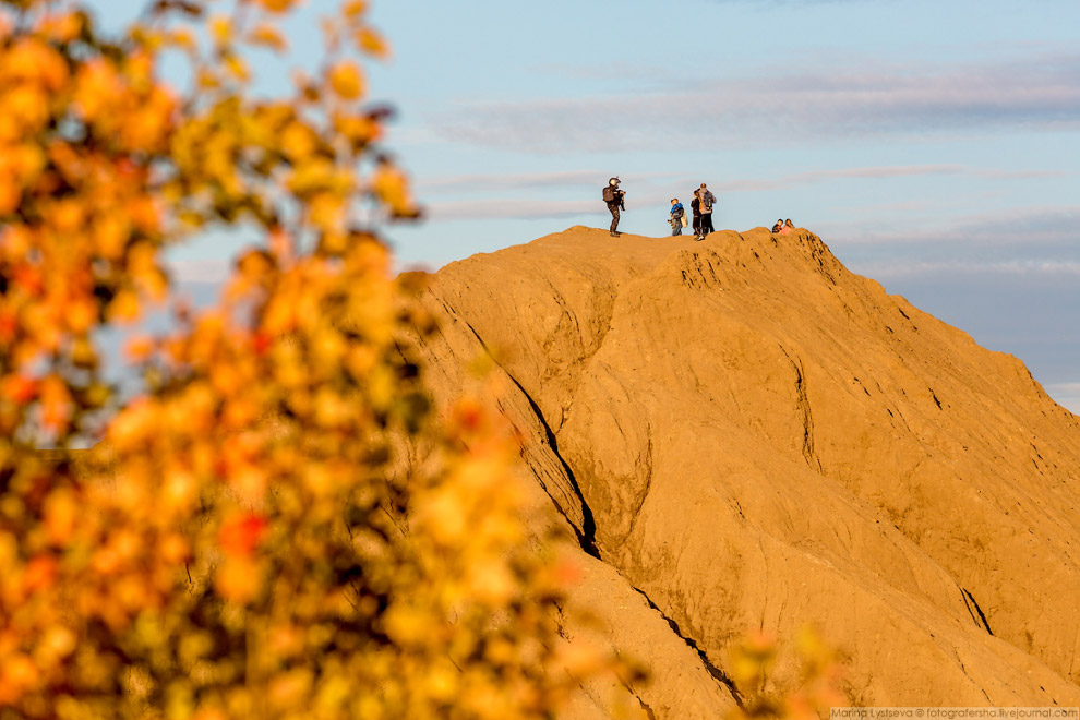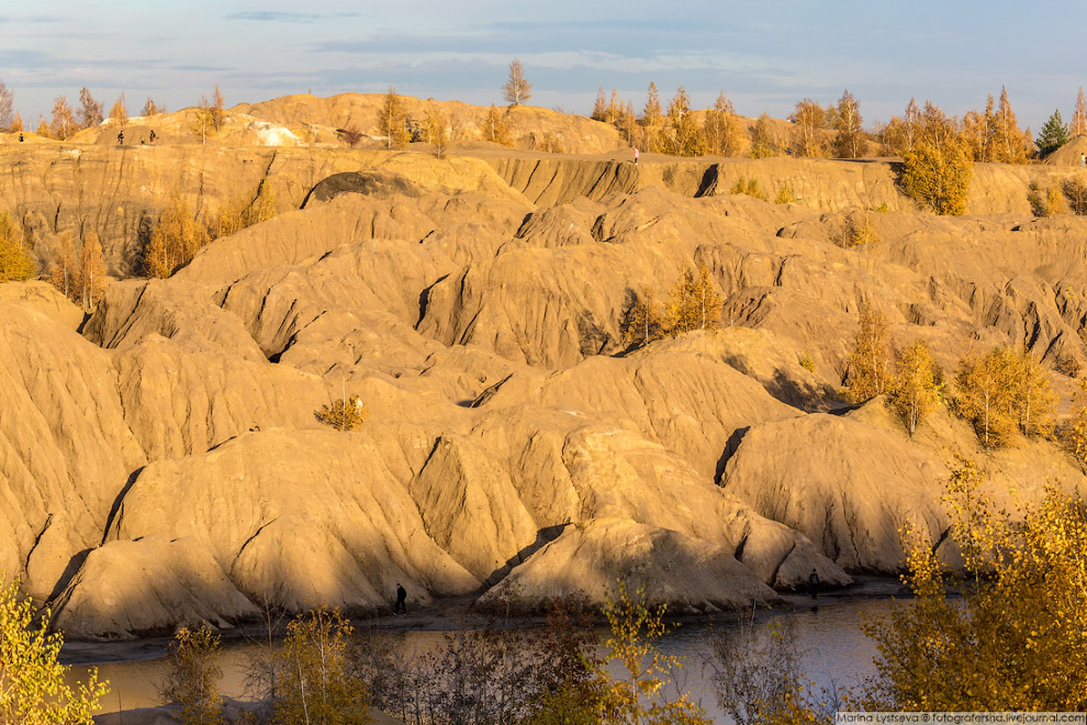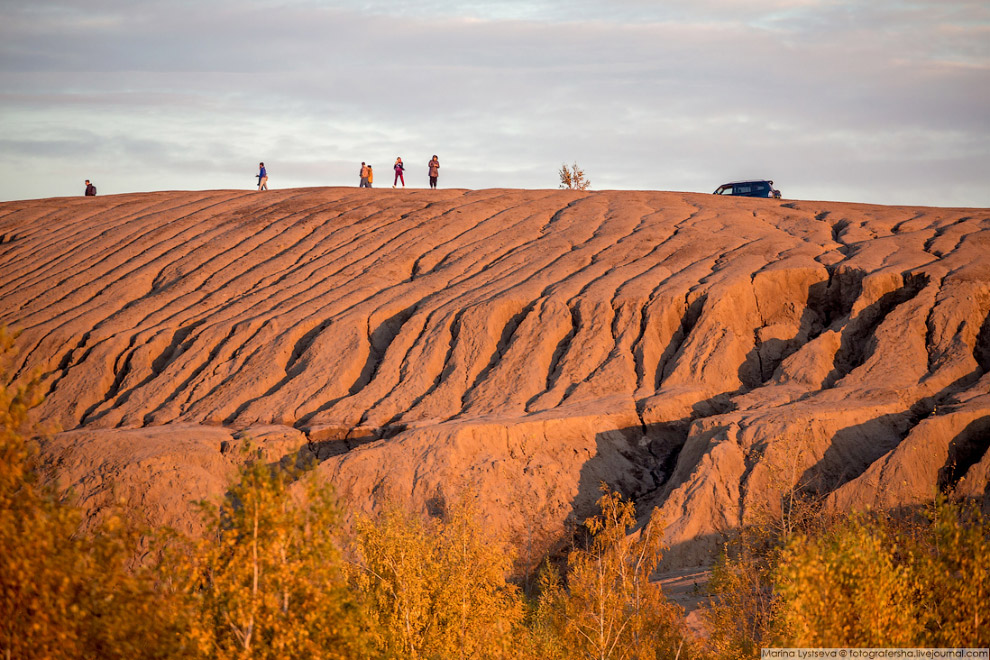 Огромные глиняные отвалы высотой до 50 метров играют на закате всеми оттенками желтого.