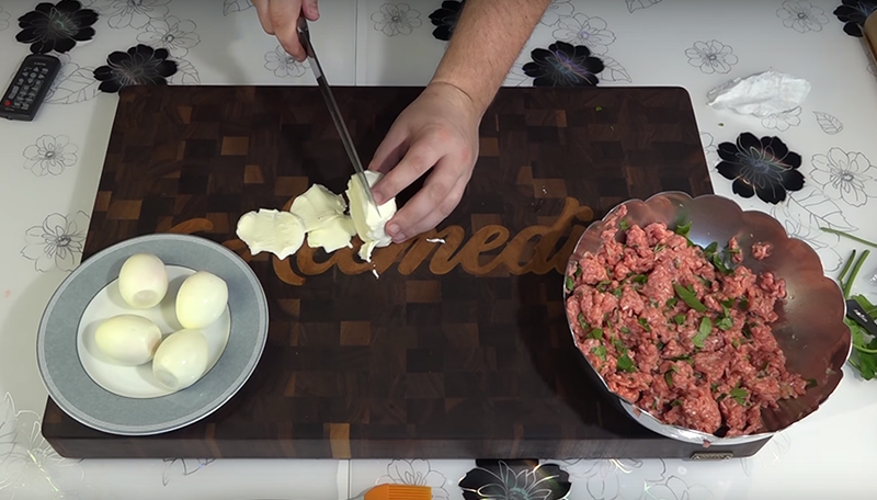Сварите 4 яйца вкрутую. Подготовьте фарш как на пельмени.