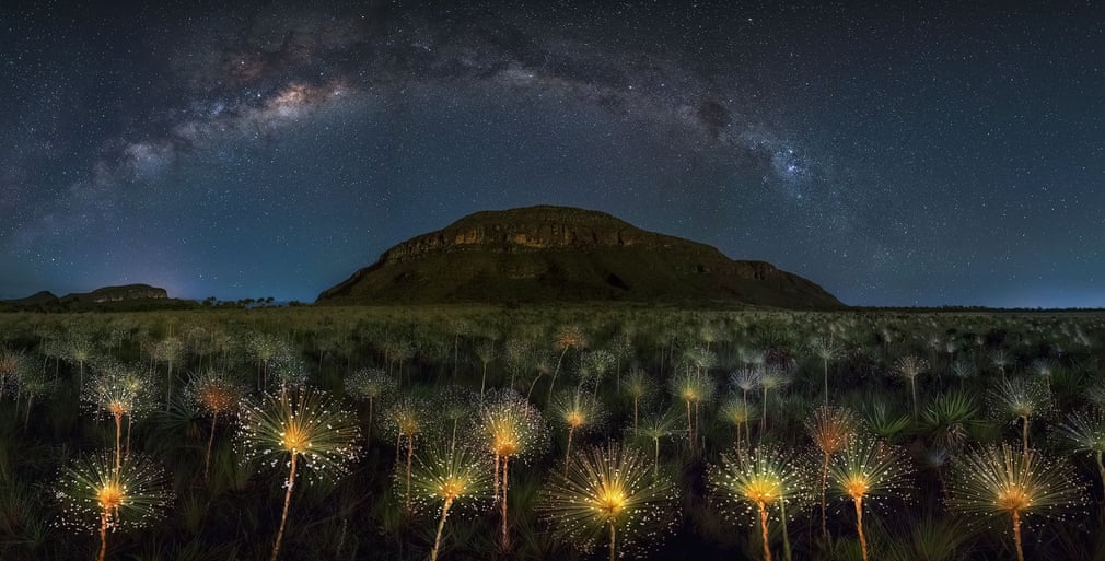 180-градусная панорама, обрамленная Млечным Путем, показывает поле цветов paepalanthus в национальном парке Veadeiros Tablelands в штате Гояс. Упоминание, категория «Красота природы».