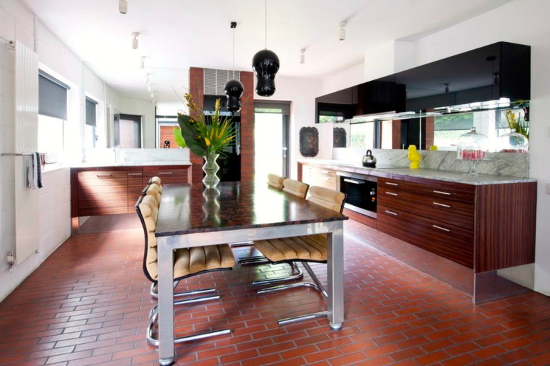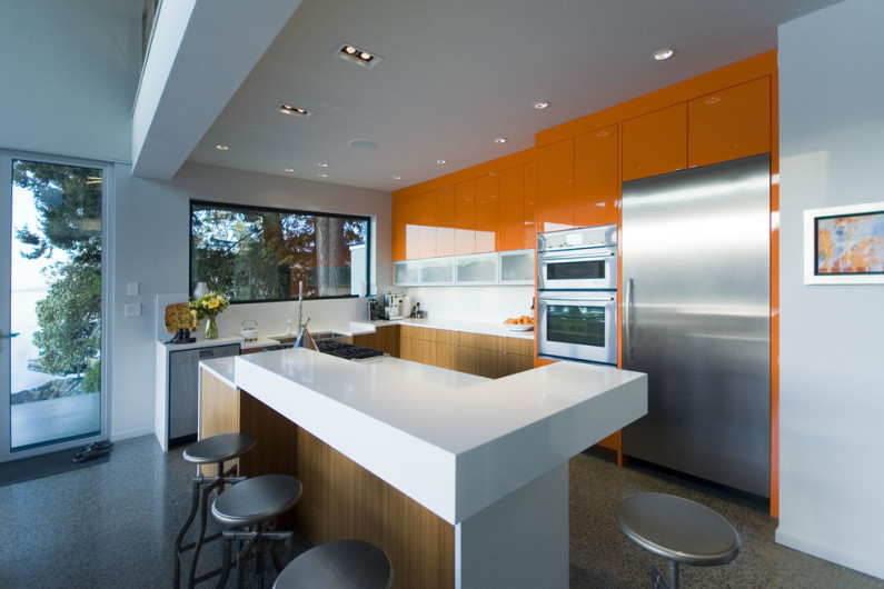 Обратите внимание, что обеденный стол в кухне модерн иногда играет довольно заурядную роль и, зависимо от количества живущих в доме людей, может быть рассчитан на 2 – 6 персон, а вот барная стойка – конструкция обязательная, если вы выбираете для кухни данный стиль интерьера.