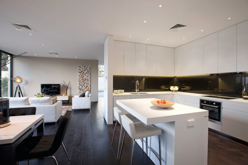 Итак, независимо от размеров комнаты, которой суждено стать кухней в стиле модерн, все предметы обстановки должны размещаться в пространстве по принципу «свобода передвижения и ничего лишнего». То есть, мебель устанавливается вдоль стен, «г» или «п»-образно, при этом, нужно, чтобы промежутки между столами и фасадами шкафов оставались достаточно просторными. В итоге вы получаете комфортное помещение, легкость в поддержании чистоты и эстетический внешний вид комнаты.