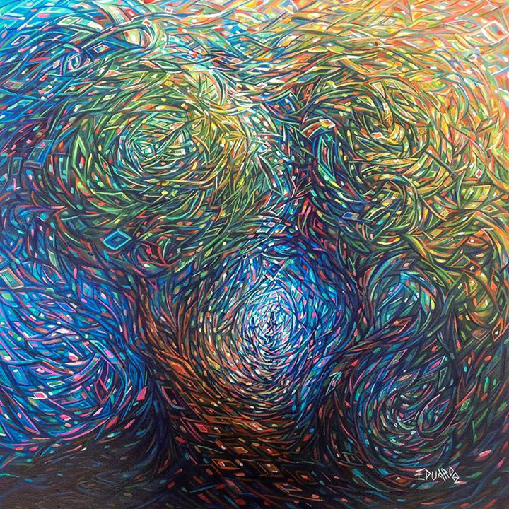 Со временем в нем проснулось желание писать маслом. Мозаика его мистических картин отображает гармонию Вселенной в необычной спиральной геометрии и ярких красках.