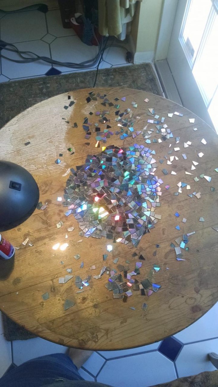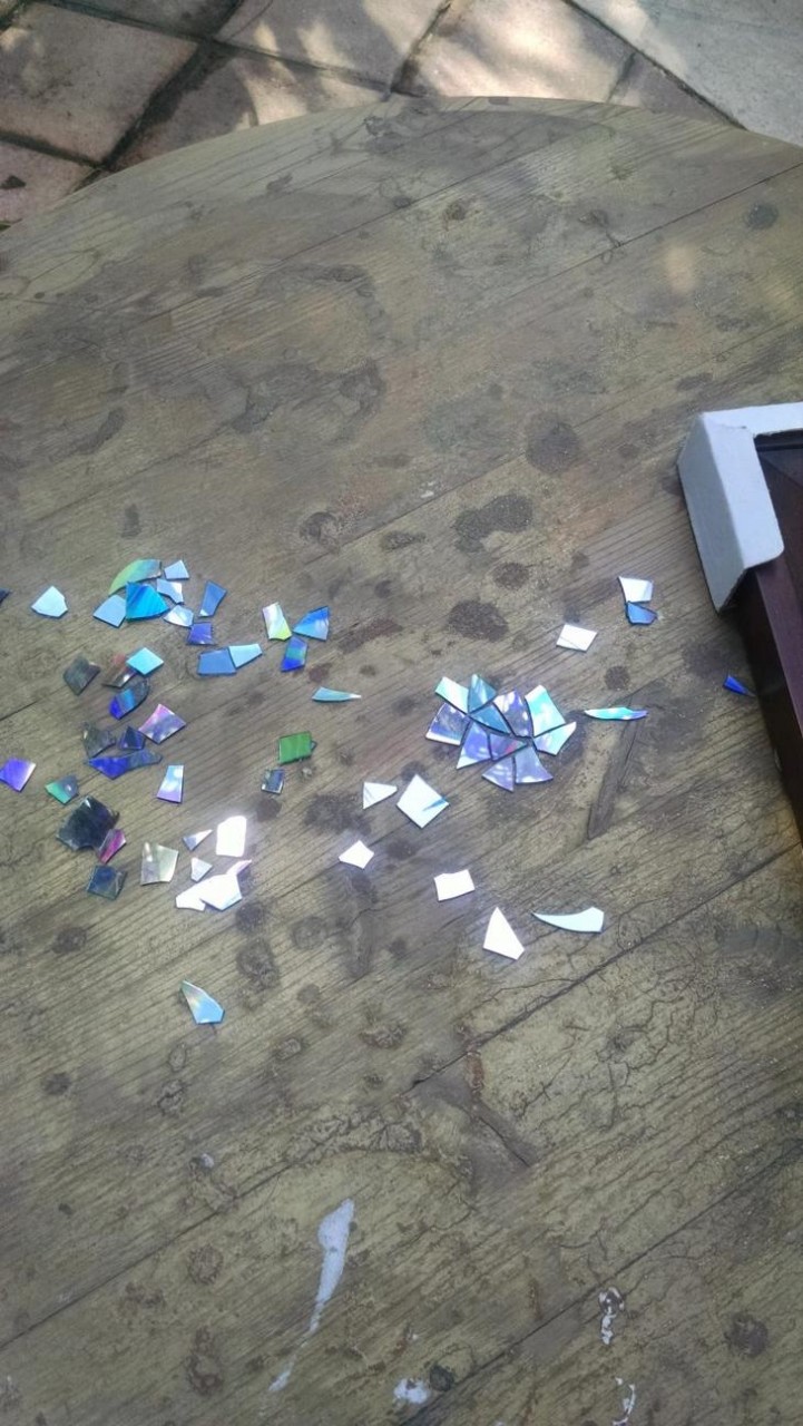 Сначала разрезаем диски на небольшие кусочки. На мозаику для этого стола ушло не менее 23 компакт-дисков.