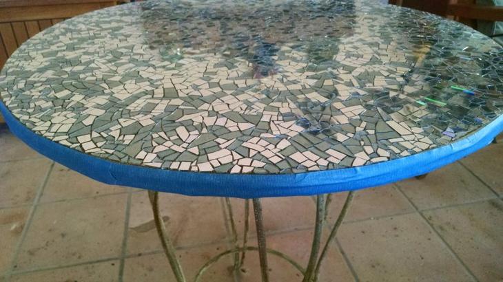 Теперь возьмите строительную замазку. Замажьте ею все зазоры мозаики, излишки удалите влажной тряпочкой