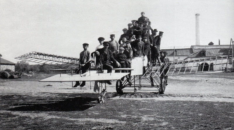 Трехместный самолет конструкции П.В.Можарова (на фото он — на самом верху) в момент проверки аппарата на прочность. Село Красивка (где он жил, переехав туда с родителями из с.Саюкино) Тамбовской губернии. Осень 1914 года.