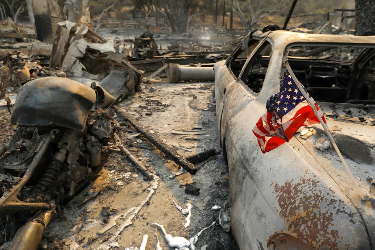 Оплавленный американский флажок на сгоревшей машине в трейлер-парке, Уэстлейк-Виллидж.