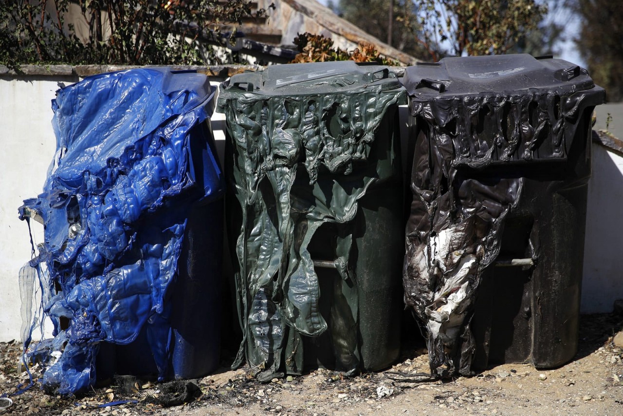 Оплавившиеся баки для мусора перед сгоревшим домом, Агура-Хиллз.