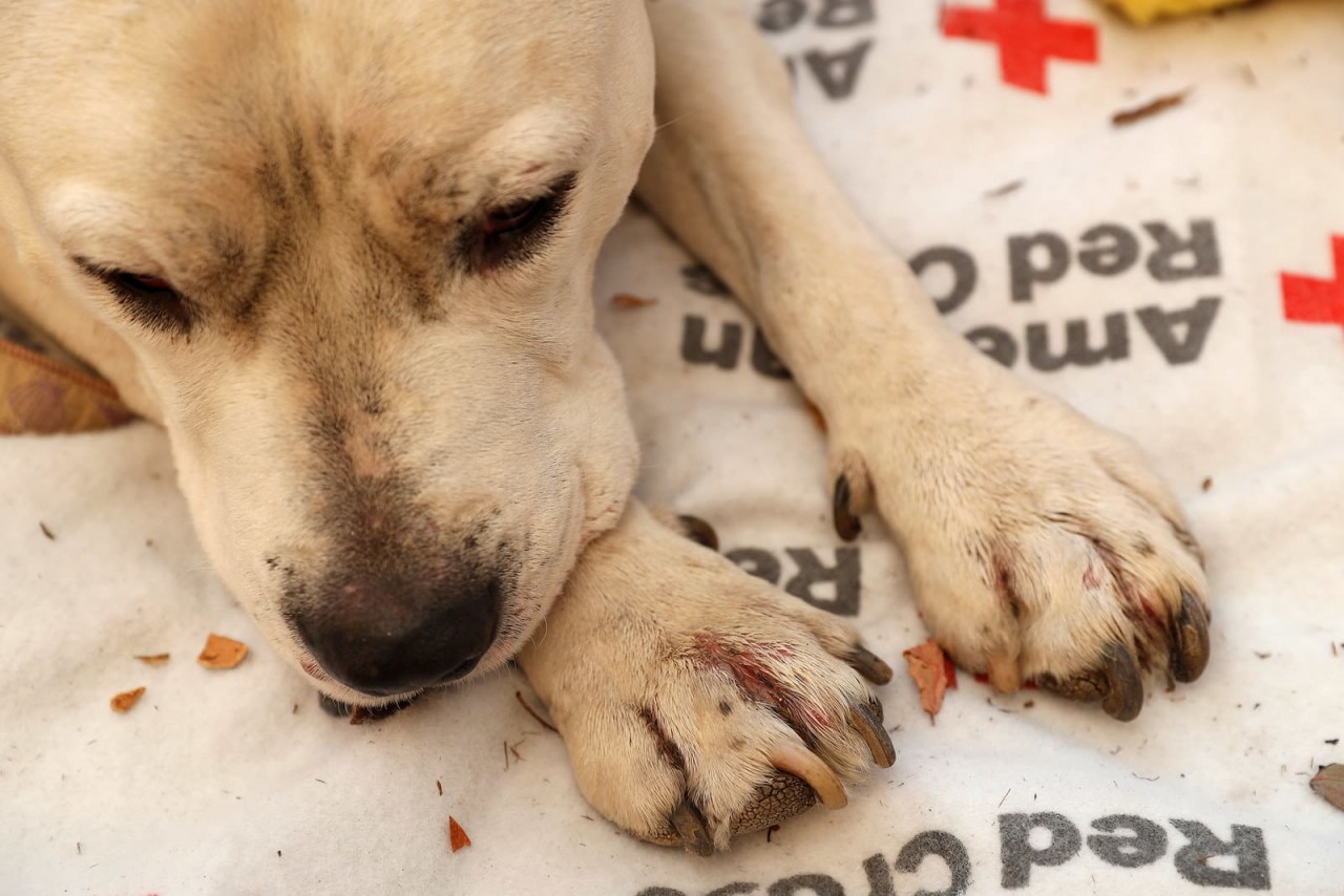 9-летний пибуль Тон, получивший ожоги лап во время пожара, отдыхает на стоянке церкви, Чико.