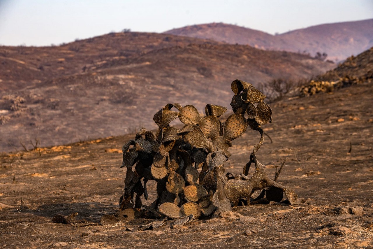 Выжженные склоны и повреждённые линии электропередачи вдоль Тихоокеанского шоссе, Малибу.