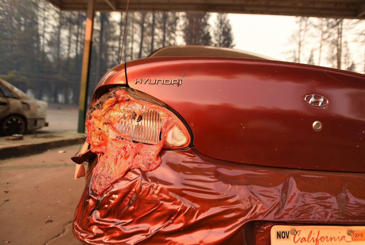 Расплавленный бампер автомобиля на сгоревшей заправке, Парадайс.
