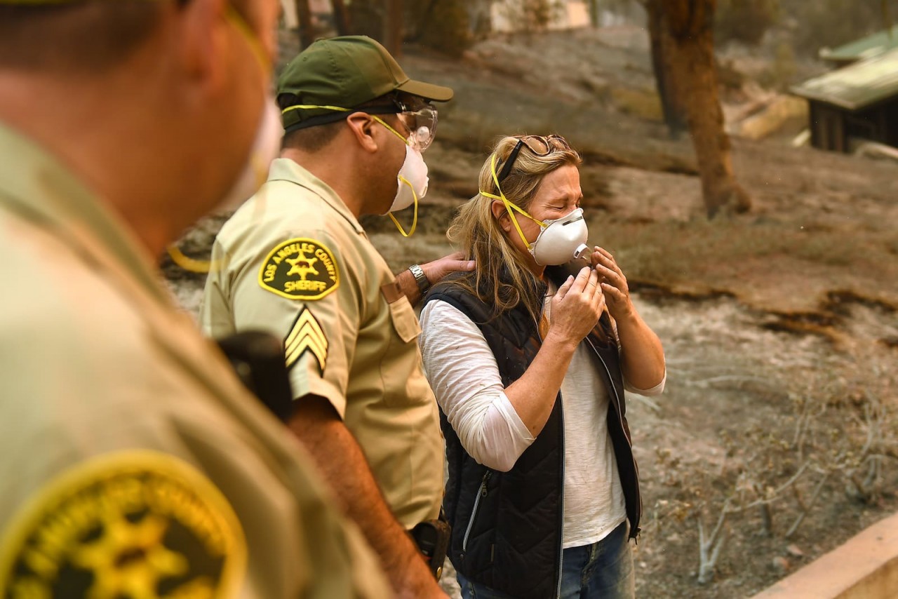Сотрудник Управления шерифа округа Лос-Анджелес Эрни Феррерас утешает Энн-Мари Мюллер после того, как сообщил ей, что её друзья в безопасности, Малибу.