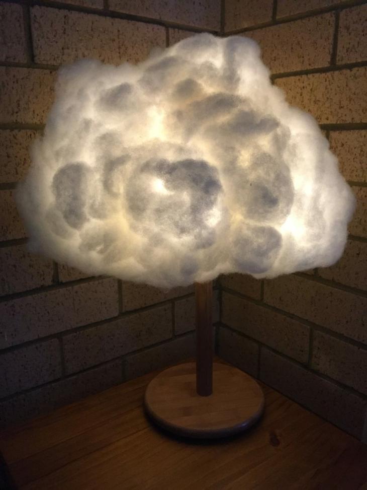 Очень эффектный вариант лампы-облака, которым можно декорировать письменный стол или прикроватную тумбочку. Вам нужна старая лампа, которую вы просто оклеите ватой. Очень удобно, учитывая, что не придется искать ни подходящий абажур, ни подставку, ни лампочку, ни источник питания. Получается лампа в форме атомного гриба.