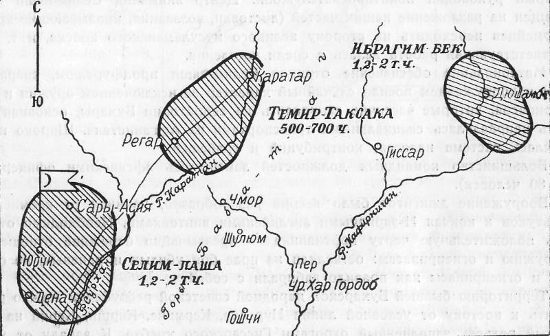 К 1 февраля 1923 г., при деятельном участии и обильной материальной помощи Англии, Селим-паше удалось собрать под свою руку все басмаческие отряды, включая и отряды наиболее крупного басмаческого вождя Ибрагим-Бека (общей численностью до 4000 - 5000 человек). Кроме того в Западной Бухаре, в районе Нур-Ата (30 - 35 км севернее Бухары) группировались отряды муллы Абду-Кагара (численностью до 2000 человек). Всего на территории БНСР силы Селим-паши исчислялись примерно в 7000 – 8000 человек (из них вооруженных – 4000 - 5000).
