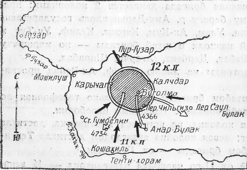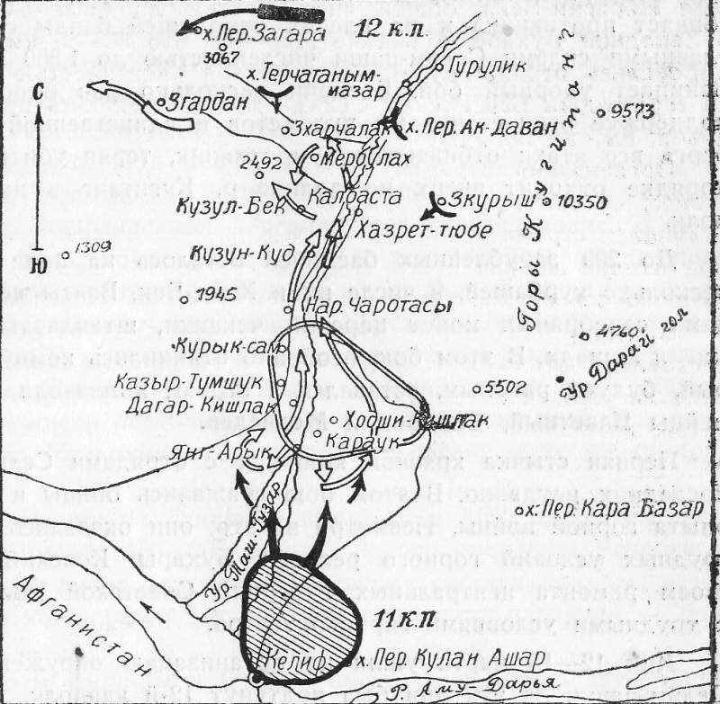 Для занятия исходного положения бригада движется 2 колоннами: правая - 11-й кавполк - по правому берегу р. Амударьи вдоль государственной границы по маршруту Киикчи, Улям, Ак-Кум, Карнас, Келиф, Уч-Тут и далее на Ширабад; левая – 12-й кавполк и штаб бригады - по маршруту Карши, Гузар, Тенги-Хорам, Ак - Рабад, Дербент, Агарчи, Ширабад.