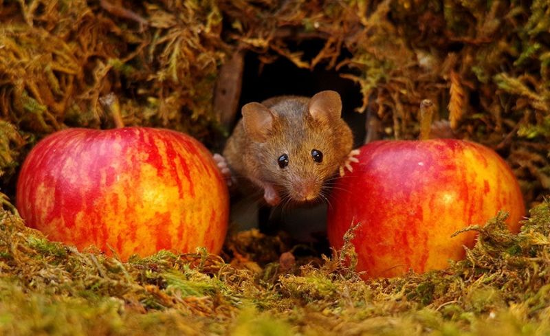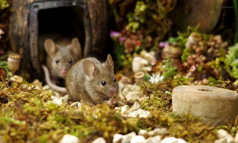 Заметив в своем саду мышонка, сердобольный британский фотограф Саймон Дэлл начал его прикармливать, а потом сделал ему домик. Вскоре к новоселу пожаловали сородичи, и Саймон на радостях построил целую мышиную деревню. Британец кормит полевок и приносит перья, чтобы они утеплялись к зиме. От соседских котов поселение надежно охраняет хозяйский джек-рассел-терьер, совершенно равнодушный к мышам.